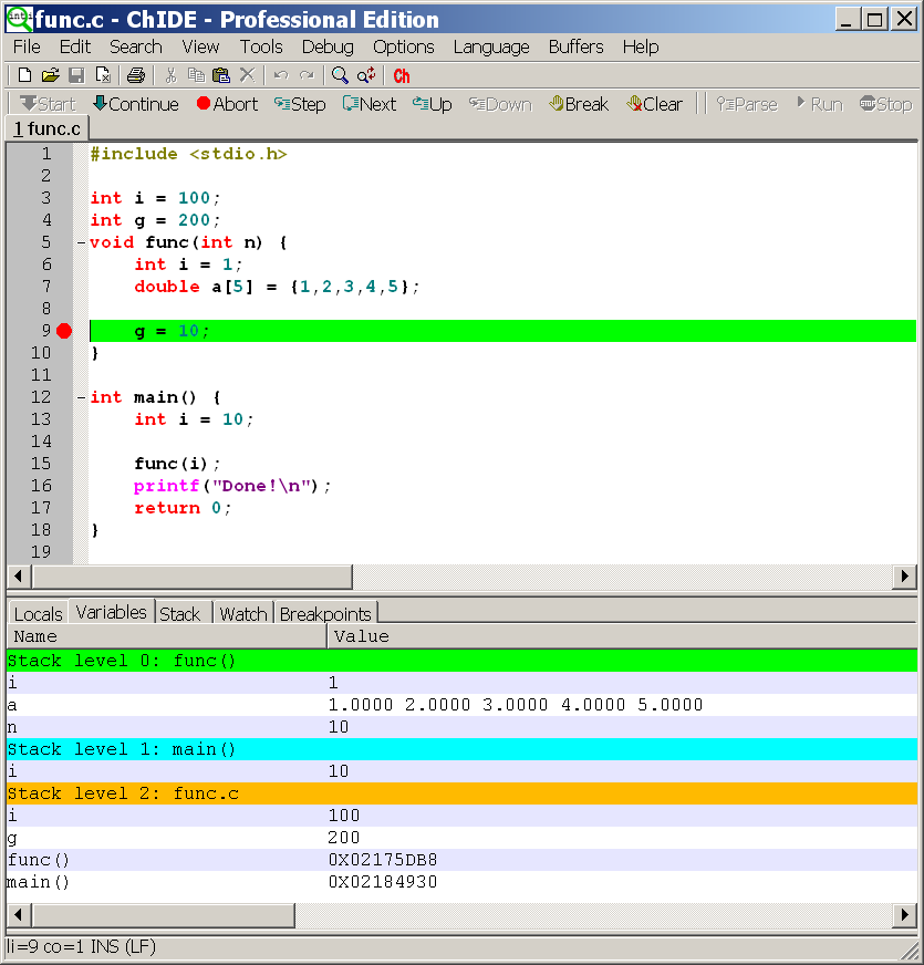 • Extensive and user-friendly debug features. You can set breakpoints, run a program step by step, watch and change values of variables during the program execution, inspect variables in different stacks with different colors, etc. ChIDE is especially developed for teaching and learning computer programming in C/C++. For example, step-by-step execution of a function helps students understand and master difficult topics such as program logic, control flow, selection statements, loops, functions, function argument pass-by-value, pass-by-reference, local and global variables, etc.