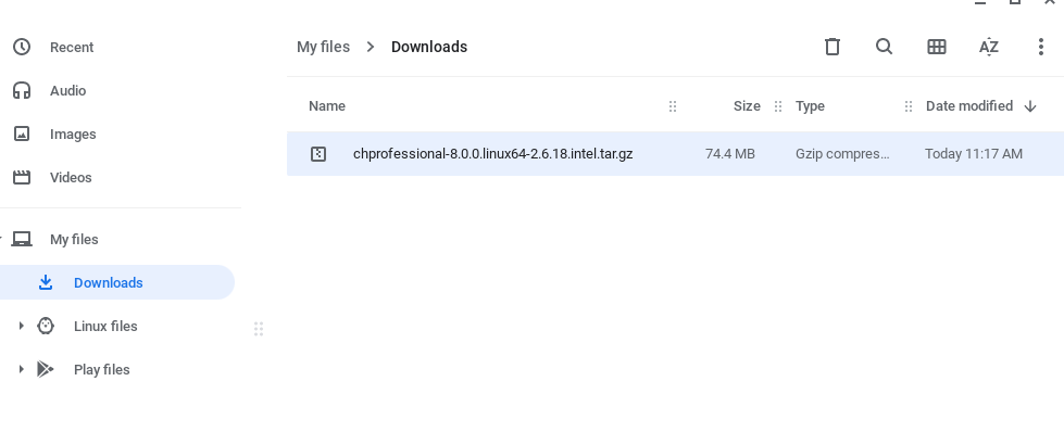 Open the Files app from Chromebook, you will find the downloaded file chprofessional-8.0.0.linux64-2.6.18.intel.tar.gz,
