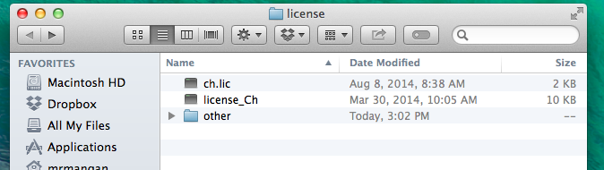 There is already a ch.lic demo license file in this folder. Click and drag the new license file ch.lic as shown in the first step into this folder to replace the existing file.